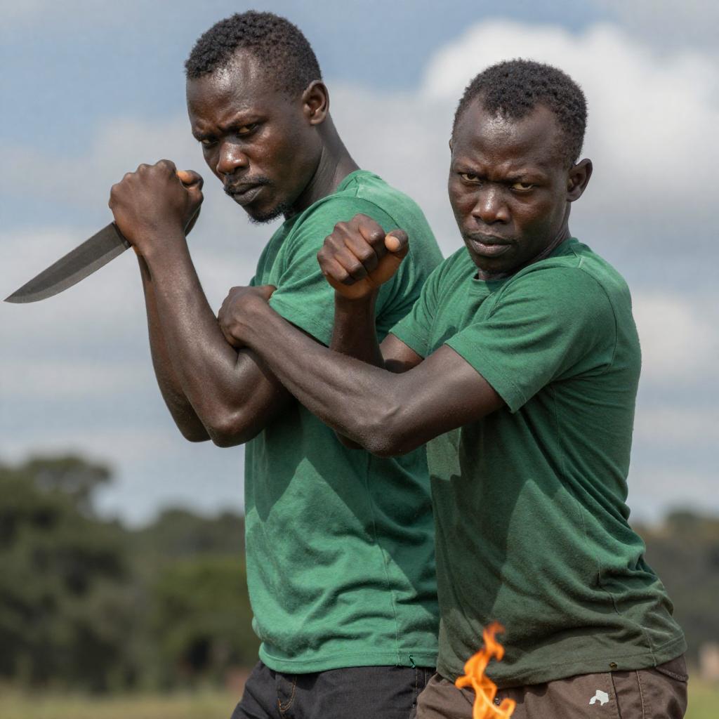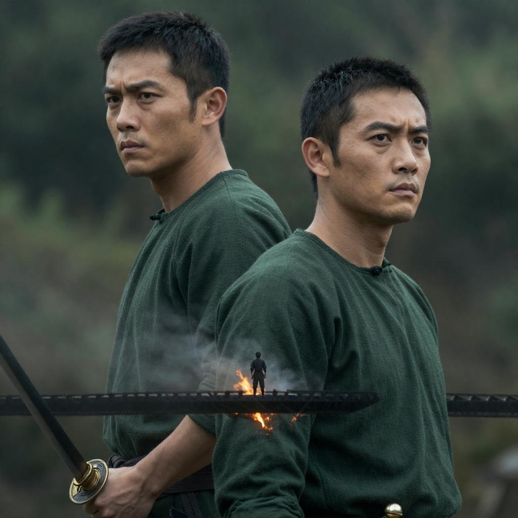 Photograph of two Asian men superimposed against a cloudy sky. Older man with short black hair stands behind younger man, both holding long knives. Younger man's expression is intense, looking forward. Clouds and green landscape are overlaid on their bodies. Background includes a distant figure on a rooftop and a small building with smoke.