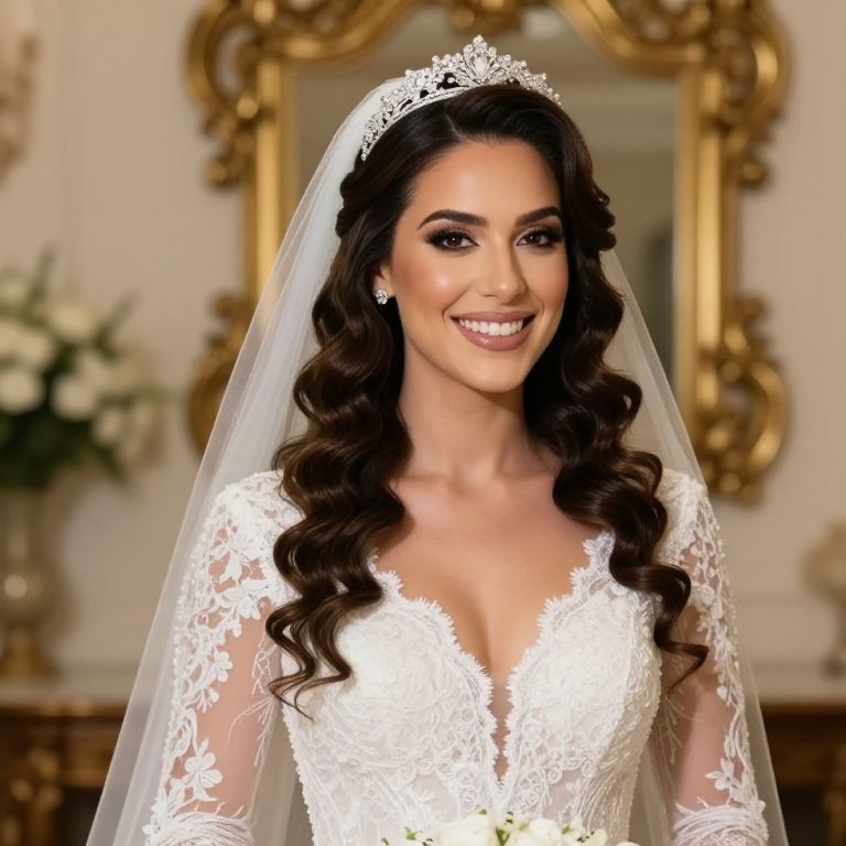 Photograph of a beautiful bride with fair skin and dark brown, curly hair. She's wearing a white lace wedding dress with long sleeves and a deep V-neck, along with a silver tiara and a sheer veil. She's smiling warmly, looking slightly to her right. The background is blurred, featuring golden ornate wall decor and some greenery. The lighting is soft and warm.