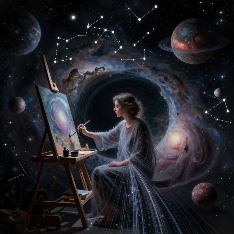 A surreal digital artwork depicts a cosmic painter, their ethereal brushstrokes visible as shimmering strands of stardust across an expansive nebula-like canvas. The perspective shifts to reveal the artist's otherworldly studio, where floating celestial bodies and distant galaxies are meticulously arranged within a black hole-framed environment. Intricate constellations and swirling cosmic storms illuminate this mesmerizing scene, evoking awe and wonder while challenging our perception of reality.