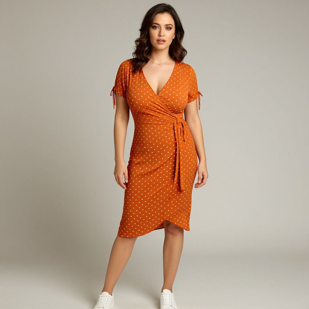 "Woman, contemporary, knee-length wrap dress in burnt orange with white polka dots, V-neck, short sleeves with tie details, ruched skirt with front tie knot, white sneakers, photo studio background.. Sexy. Pretty face and beаutiful eyes. Big breasts."