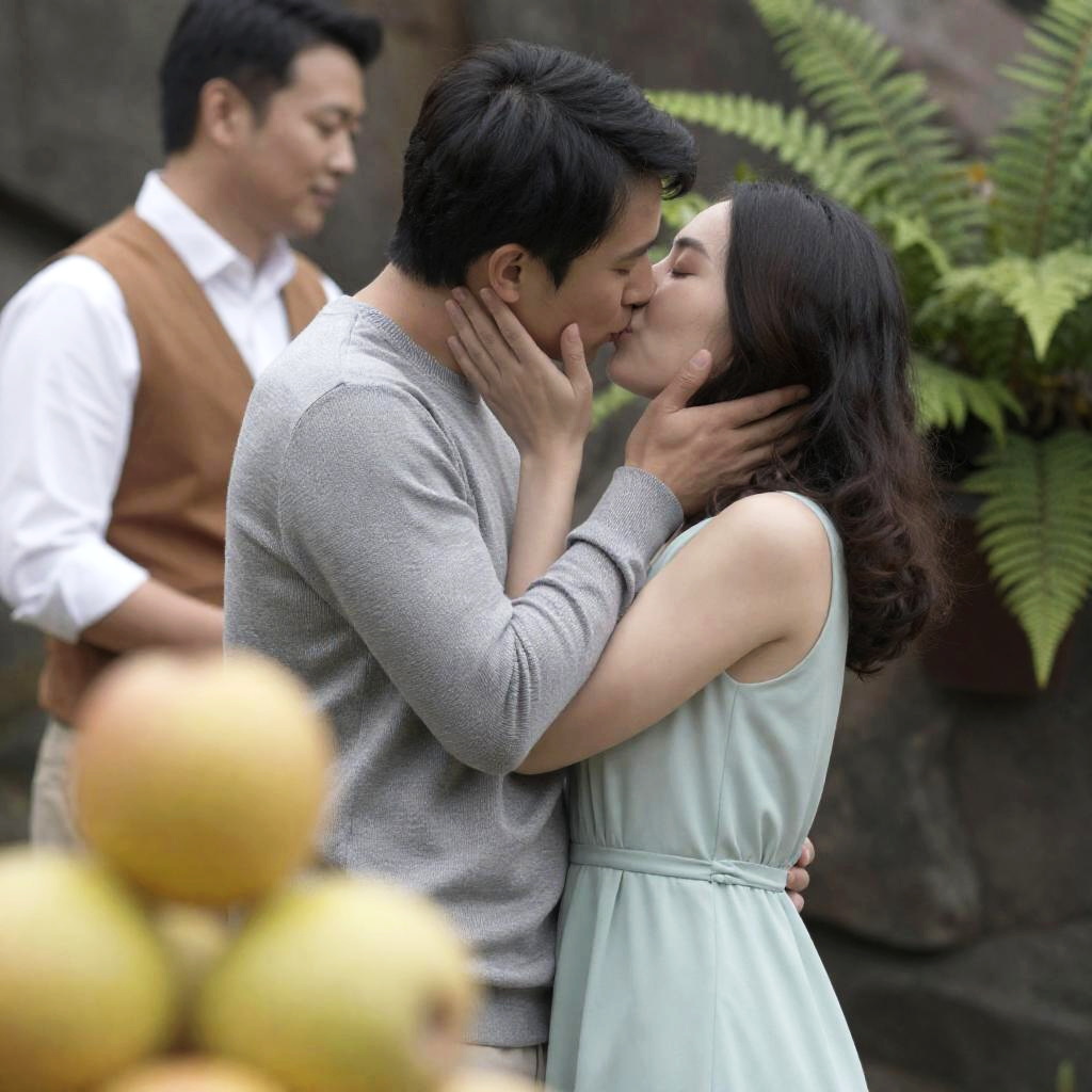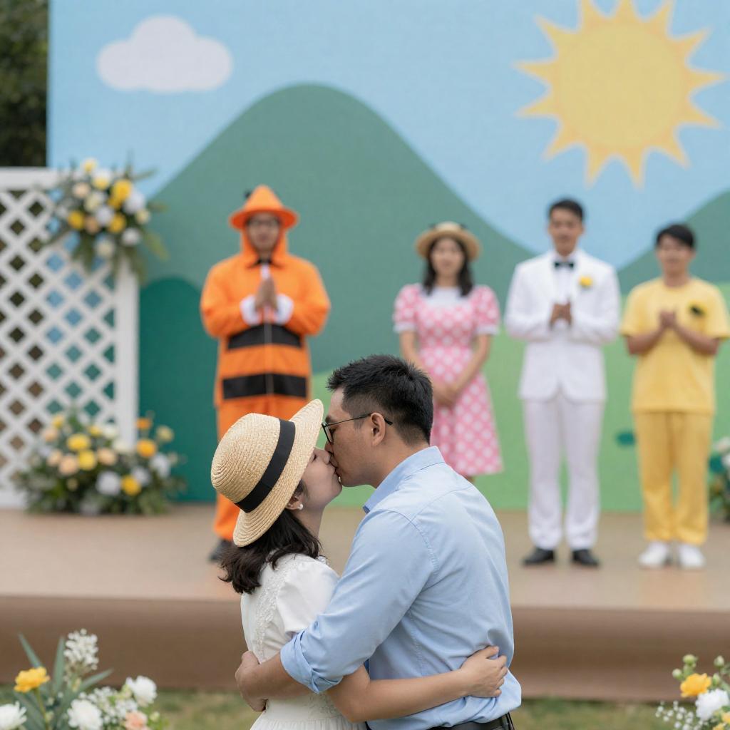 Photograph of a colorful outdoor wedding ceremony. A man in a light blue shirt kisses a woman with a straw hat in the foreground. Four costumed performers in bright outfits stand on a stage with a painted mountain and sun backdrop. One performer wears an orange beekeeper suit, another a pink polka-dot dress, and two others in white and yellow. A white lattice with flowers is on the left.