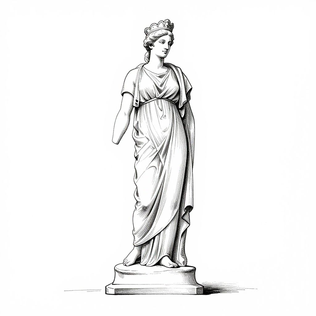 The image is a minimalist black and white ink drawing of a Greek statue, standing on a pedestal. The statue, depicted with a light touch and a sense of fluidity, features a woman with a serene expression, her head adorned with a crown. She is draped in a flowing garment that drapes elegantly over her body, with the fabric creating soft, curved lines that contrast with the sharp angles of the pedestal. The pedestal itself is simple, with a rectangular base and a slightly rounded top, providing a solid foundation for the statue. The overall composition is balanced, with the statue centrally positioned and the pedestal slightly to the left, creating a sense of harmony and proportion. The use of light and shadow adds depth and dimension to the drawing, highlighting the contours of the statue and the texture of the pedestal. The background is a plain white, which further emphasizes the silhouette and the intricate details of the statue and pedestal.
