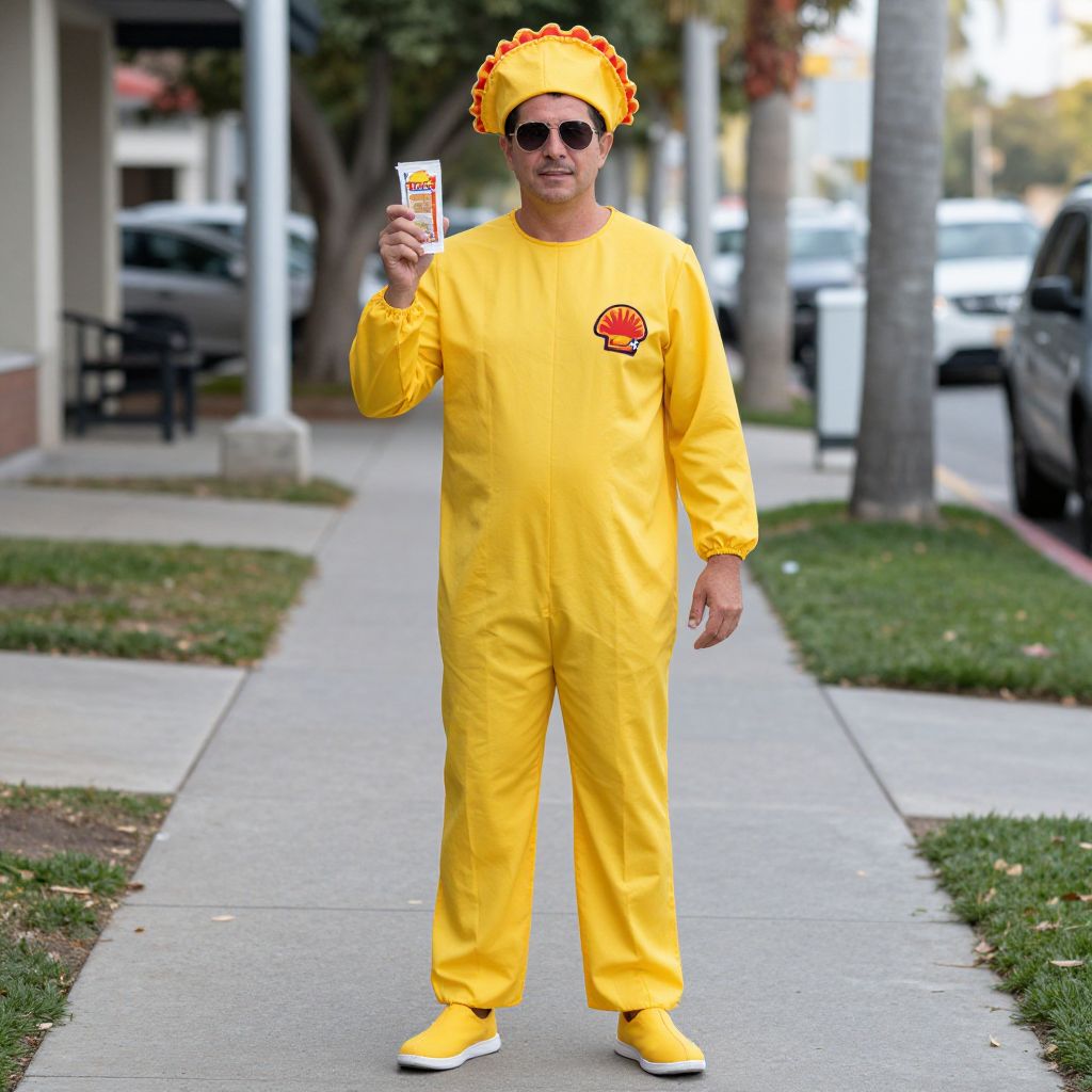 Taco Bell Sauce Packet Adult Costume, man in a taco bell costume standing on a sidewalk