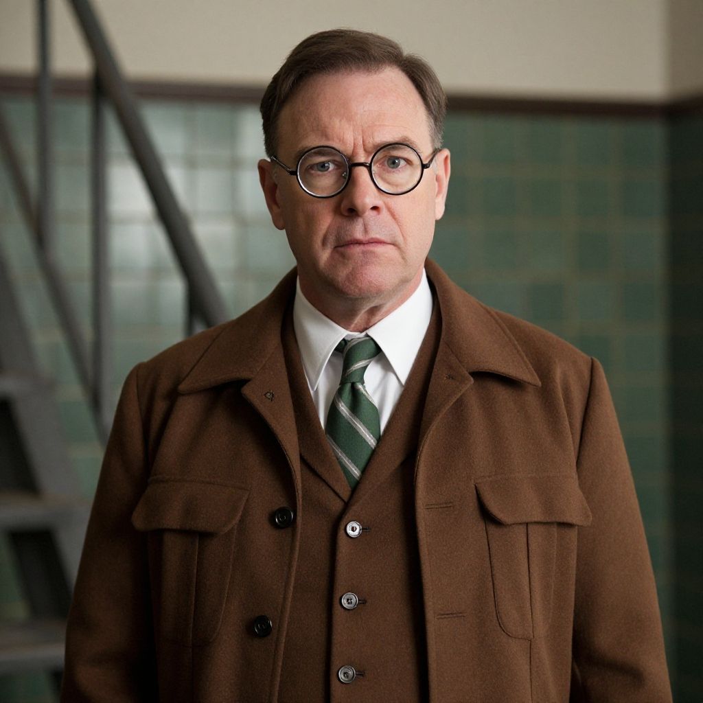 Photograph of a stern-looking middle-aged white male police officer in a black uniform, standing in a dimly lit, wood-paneled office with brass
