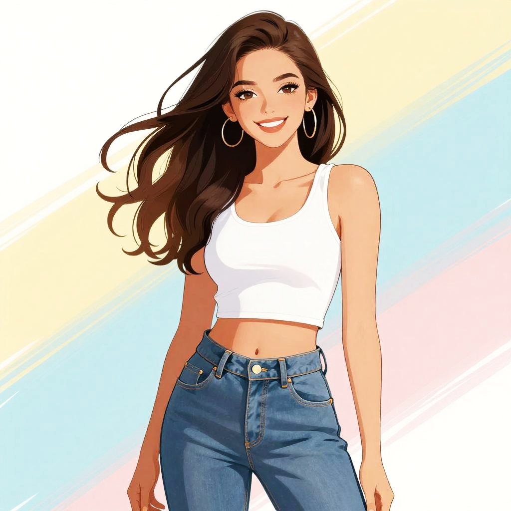 Digital illustration of a tan-skinned woman in a white crop top and fringed shorts, wearing a straw hat, jewelry, and bracelets, standing by