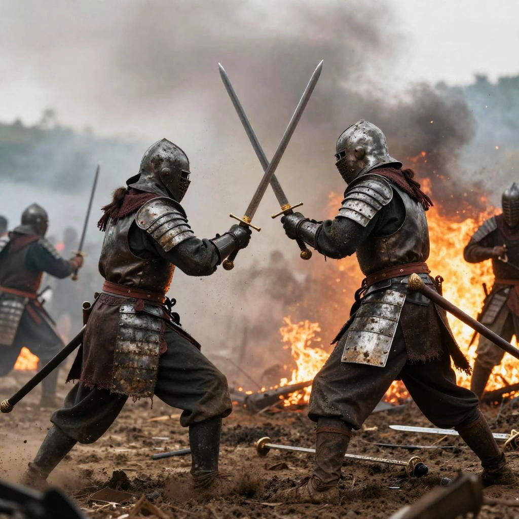 Two people fighting with swords amidst a burning battlefield, smoke and fire in the background, muddy terrain, warriors in detailed armor, high contrast lighting emphasizing tension