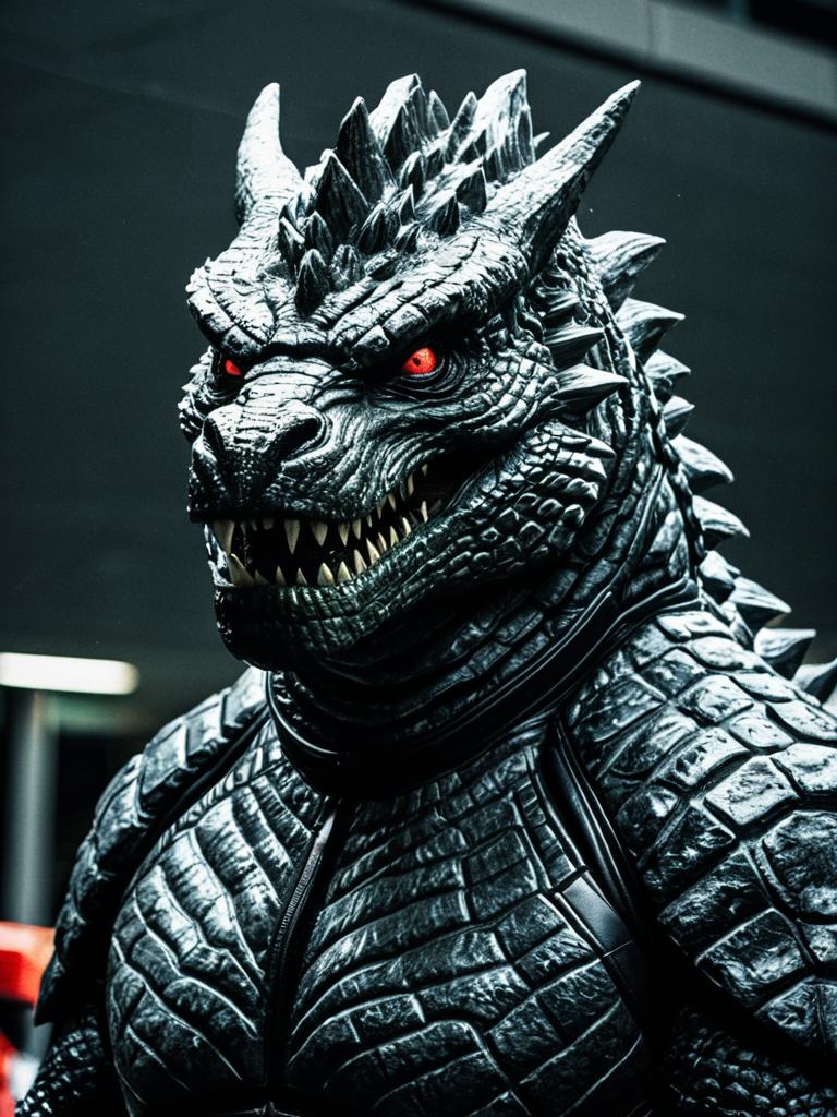 Man in Godzilla Costume, photorealistic monster cosplay portrait, cinematic realism