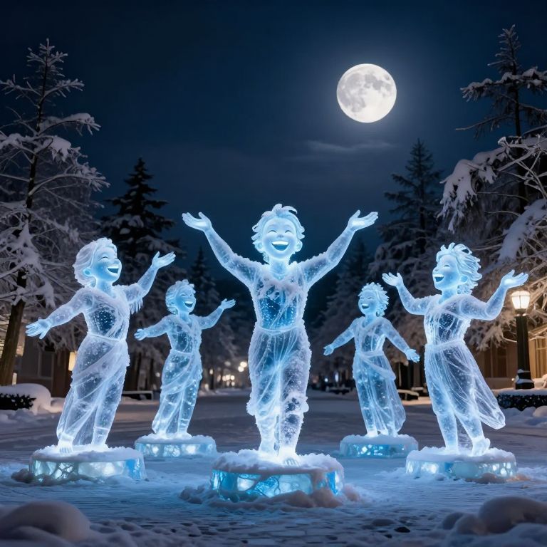 Moonlit plaza showcases five luminous sculptures of frozen laughter, each capturing the essence of joy with glowing visages and outstretched arms, set against a backdrop of snow-covered trees and a full moon.
