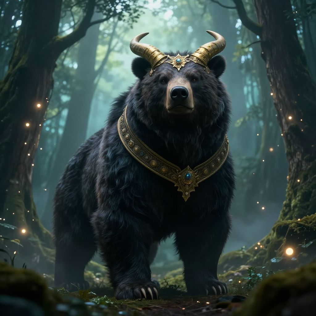 A majestic and fearsome centaur-bear creature with a powerful bulk and shadowy mane, adorned with an ornate golden headpiece and decorative chest armor, standing in an ancient enchanted grove. The mystical forest features tall illuminated trees, soft mist, and glowing orbs of light floating around the creature, creating a magical and otherworldly atmosphere.