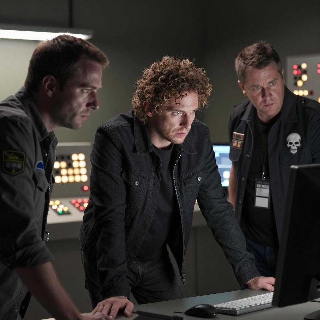 Three men in a dimly lit, industrial control room. Center man with curly hair, intense expression, leans forward, wearing dark jacket. Left man with short hair, focused, wearing gray shirt with patches. Right man with short hair, stern expression, pointing at a console, wearing dark shirt with skull emblem. Control panel with illuminated buttons in background.