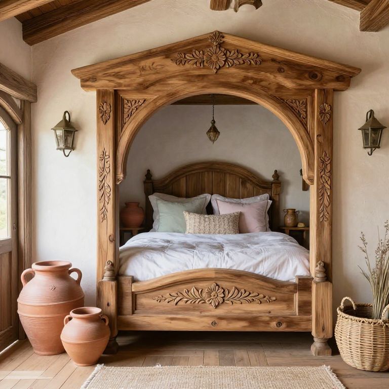 Cozy bedroom featuring a king-sized bed with white linens and mustard accents, positioned beneath wooden beams, flanked by two bedside tables with lamps, and overlooking a serene lake view through large windows draped with beige curtains, complemented by warm lighting and decorative elements including a framed landscape print, a patterned rug, and potted plants.