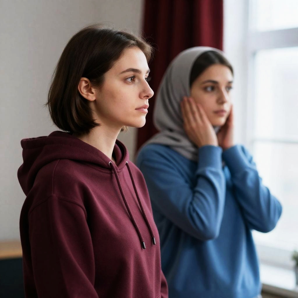 Portrait of two young women standing indoors with a white wall background. The woman in the front has brown hair tied in a ponytail, wearing a green cardigan over a white button-up shirt, and has a serious expression. The woman in the background has long brown hair and is dressed in a dark sweater with a neutral expression. Soft indoor lighting highlights their faces.