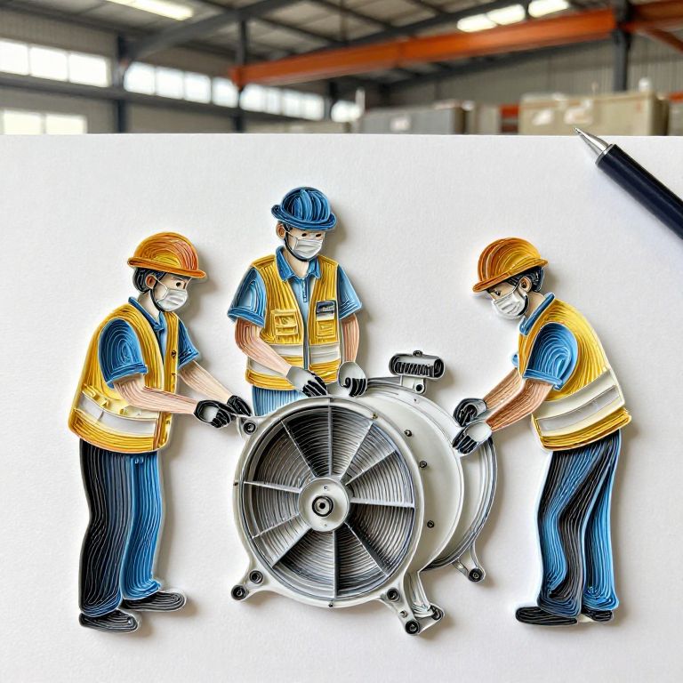 Paper Quilling realistic picture with satisfied workers together on assembling axial industrial fans in a logistics industrial fans warehouse,