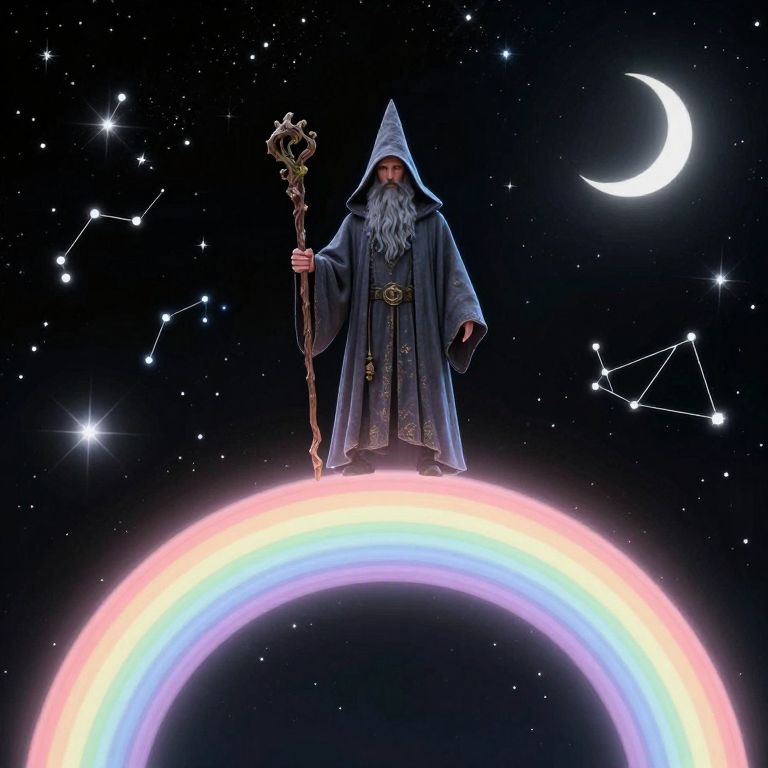 A surreal and fantasy artwork featuring a classic wizard with a long gray beard and a pointed hood, standing atop a glowing pastel rainbow, The wizard holds a wooden staff adorned with subtle natural elements, surrounded by a night sky filled with countless stars and crescent moons, The backdrop is a deep black space, highlighted by shimmering constellations and glowing celestial elements, The rainbow creates a magical bridge, curving softly under the wizard’s feet, radiating a dreamlike and mystical atmosphere, The scene captures a sense of tranquility, mystery, and otherworldly charm