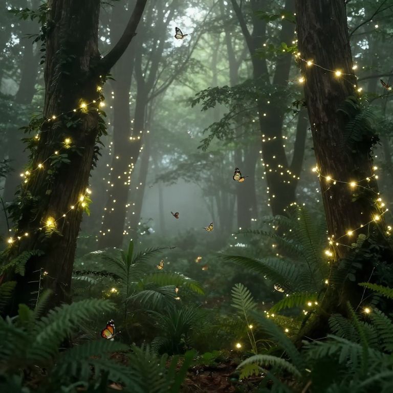 Aesthetic:1cnwsfm_gus= visualized as a surreal forest scene bathed in misty light, lush greenery intertwined with sparkling fairy lights, delicate butterflies fluttering around, capturing an enchanting and whimsical atmosphere rich in soft glow and hidden details