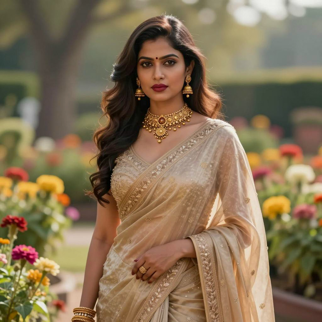 Photorealistic portrait of an elegant Indian woman with long wavy dark brown hair, wearing a beige silk saree with delicate embroidery and a sleeveless blouse. She is adorned with intricate gold jewelry including a choker necklace, matching earrings, bangles, and a ring. The woman has dark red lipstick and soft makeup, standing in a vibrant flower garden with colorful blurred flowers and warm natural sunlight creating a serene atmosphere.