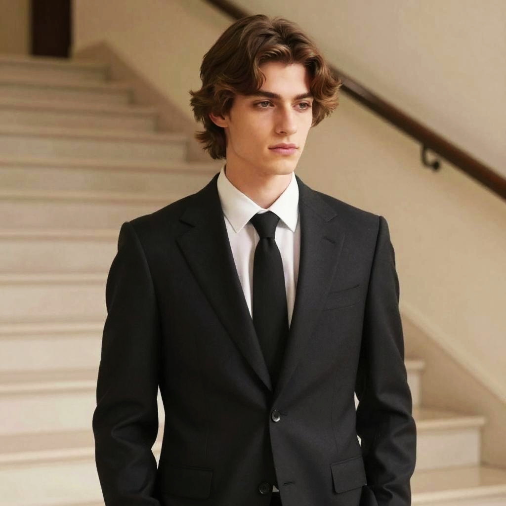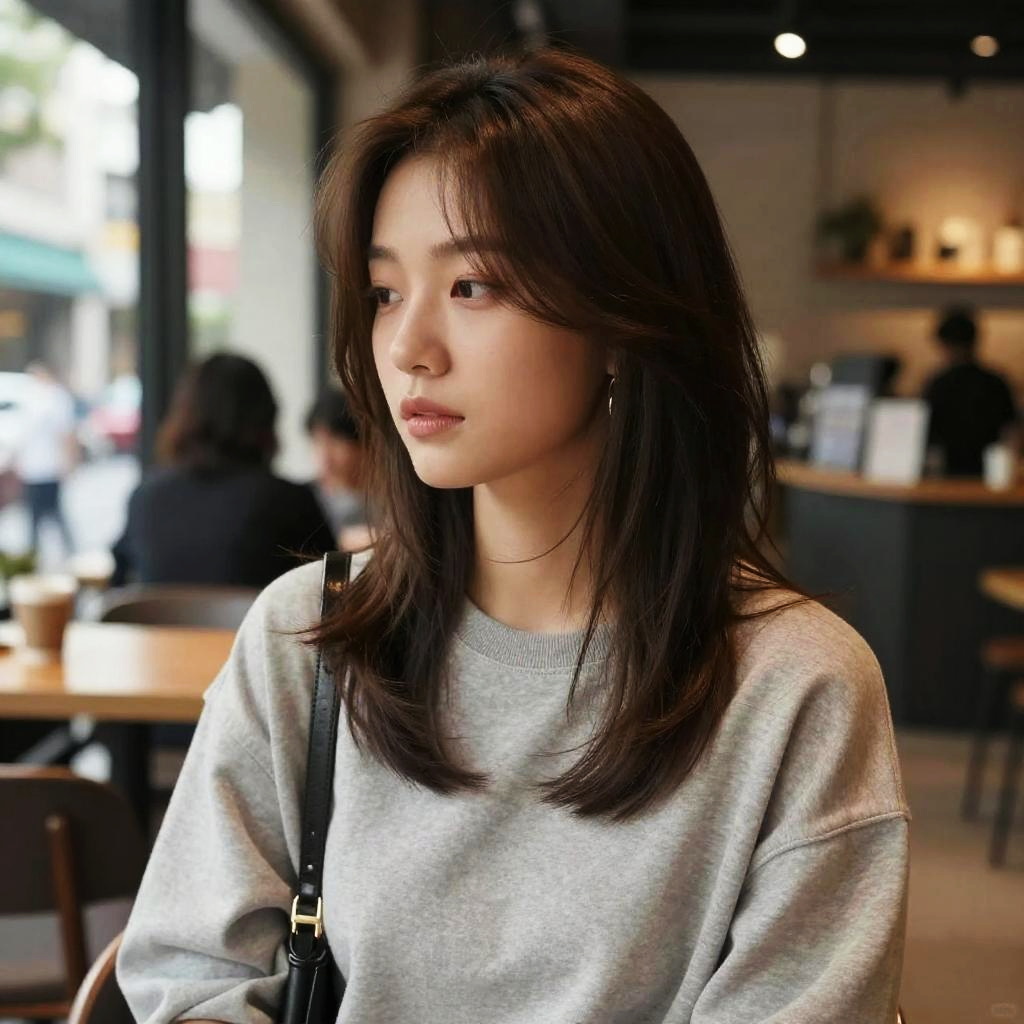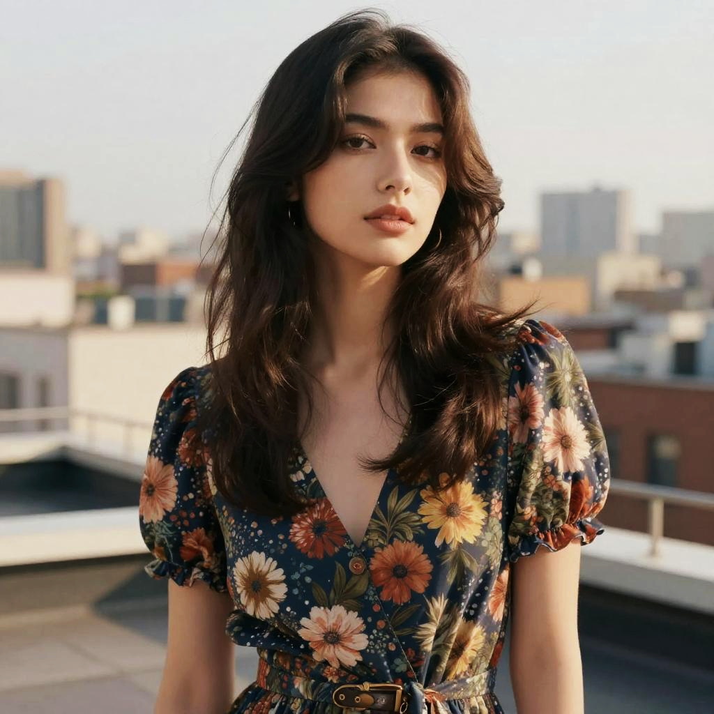 V-Cut Layers hairstyle on dancer, wearing fashion dress, in outdoor terrace, captured in fashion editorial style with warm glow.
