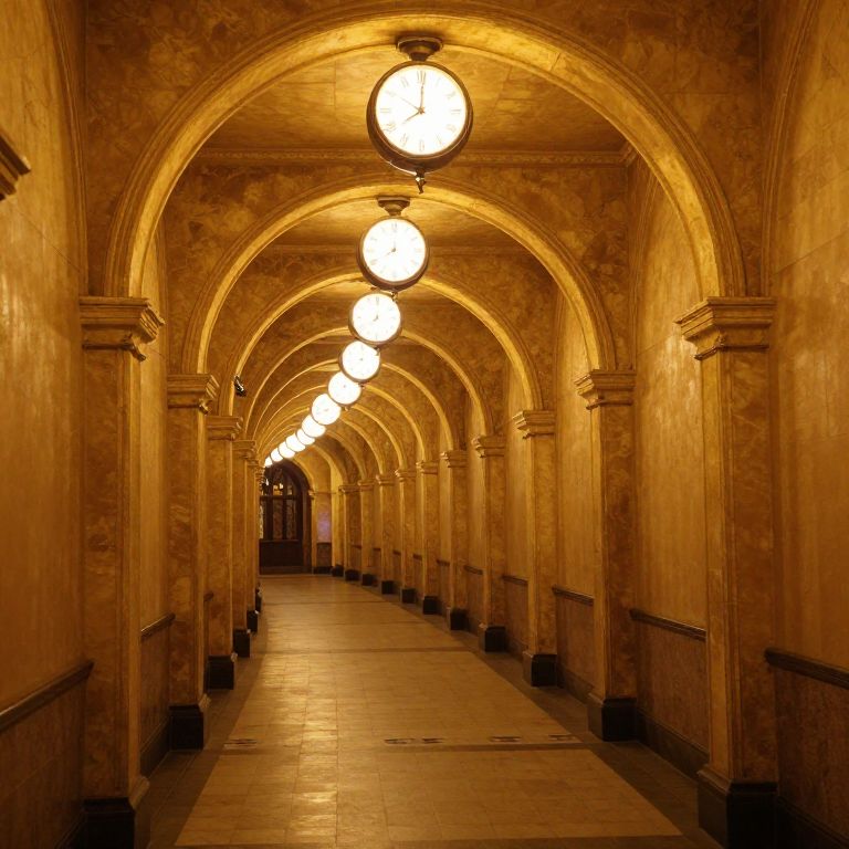 An endless corridor of golden archways and glowing clocks spirals infinitely into the distance, defying perspective and time in a surreal, timeless hall.