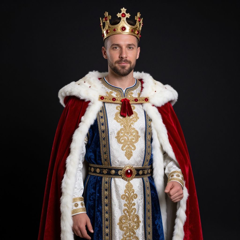 A man dressed in an elaborate king's costume stands confidently against a dark backdrop. He wears a richly decorated blue and white tunic with intricate gold embroidery, a luxurious red velvet cape trimmed with white fur, and a golden crown adorned with red jewels, embodying regal and historical cosplay style.