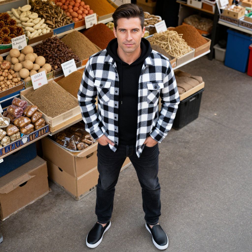 A man, classic black and white checkered flannel shirt, tapered dark wash jeans, sleek black slip-on shoes, fitted black hoodie, modern street style, vibrant stalls, fresh produce, aromatic spices, overhead shot, relaxed pose with hands in pockets, confident smile.Man has masculine face and piercing eyes