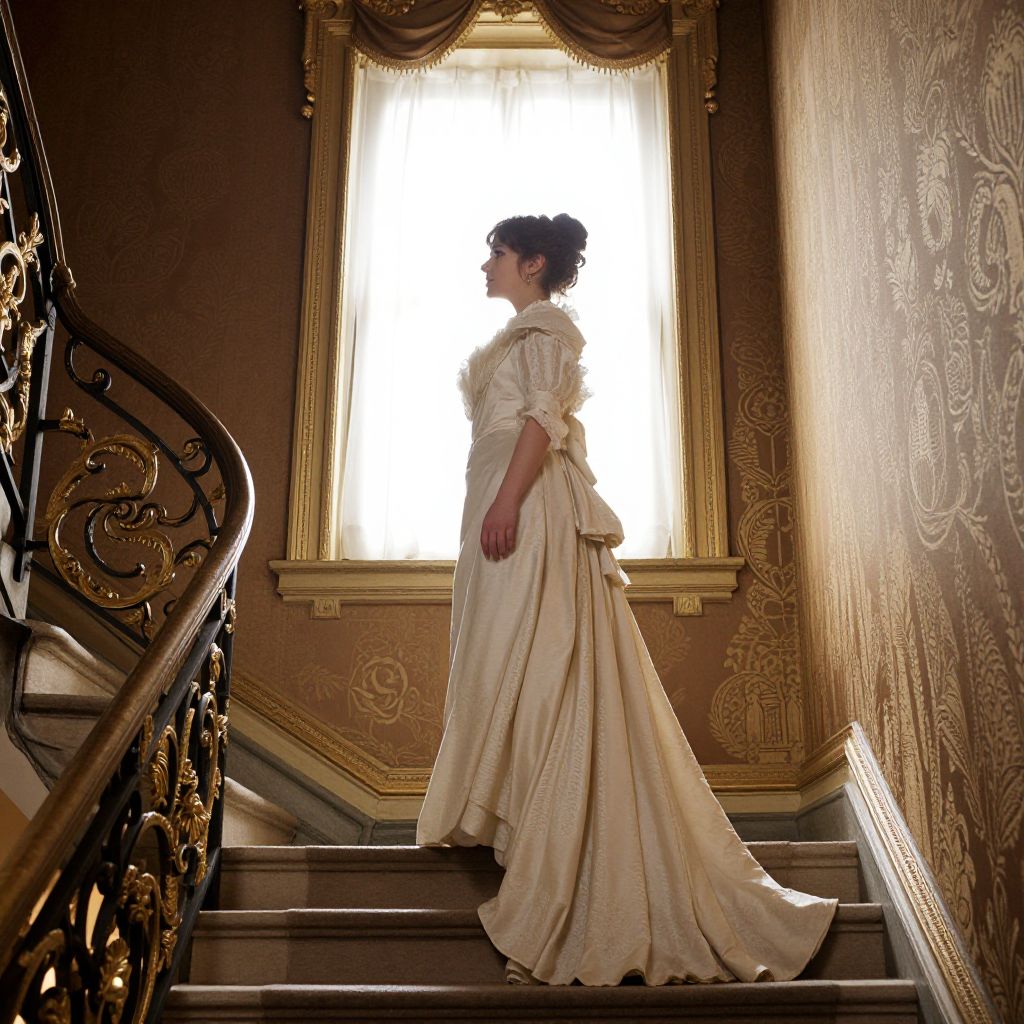 Elegantly attired Victorian woman stands poised atop a grand, ornate staircase, her cream gown cascading gracefully as she gazes out the window framed by richly patterned wallpaper and golden accents.