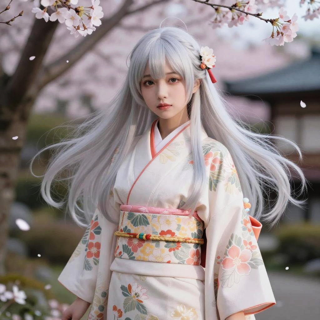 Waifu:wdu1gruipyg=, fantasy-themed waifu character in elegant traditional kimono with floral patterns, long flowing silver hair, soft expressive eyes, surrounded by cherry blossom petals in a serene Japanese garden under a twilight sky, delicate lighting, painterly style