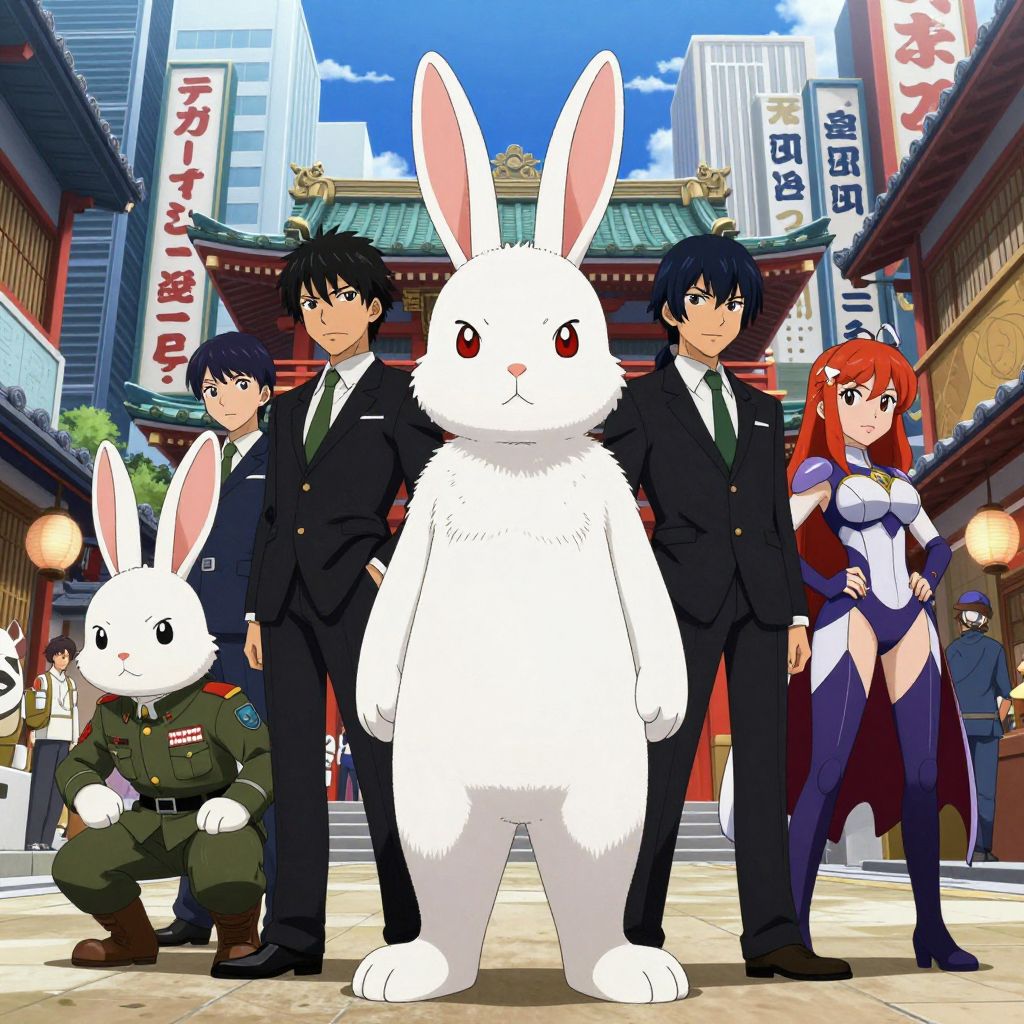 In this vibrant and dynamic scene, a group of anthropomorphic rabbits and humans stand together in front of a Japanese building, exuding a sense of camaraderie and readiness. The central figure, a large white rabbit with striking red eyes, stands tall and proud, flanked by a man in a suit and a woman in a futuristic outfit. To the left, a smaller rabbit in a military-style uniform crouches, adding to the group's sense of unity and purpose. The background features tall, ornate buildings adorned with traditional Japanese signage, creating a striking contrast between the modern and the traditional. The interplay of colors, from the sleek black of the man's suit to the vibrant red of the woman's hair, and the textured fur of the rabbits, creates a visually rich tapestry that captures the essence of this unique gathering.