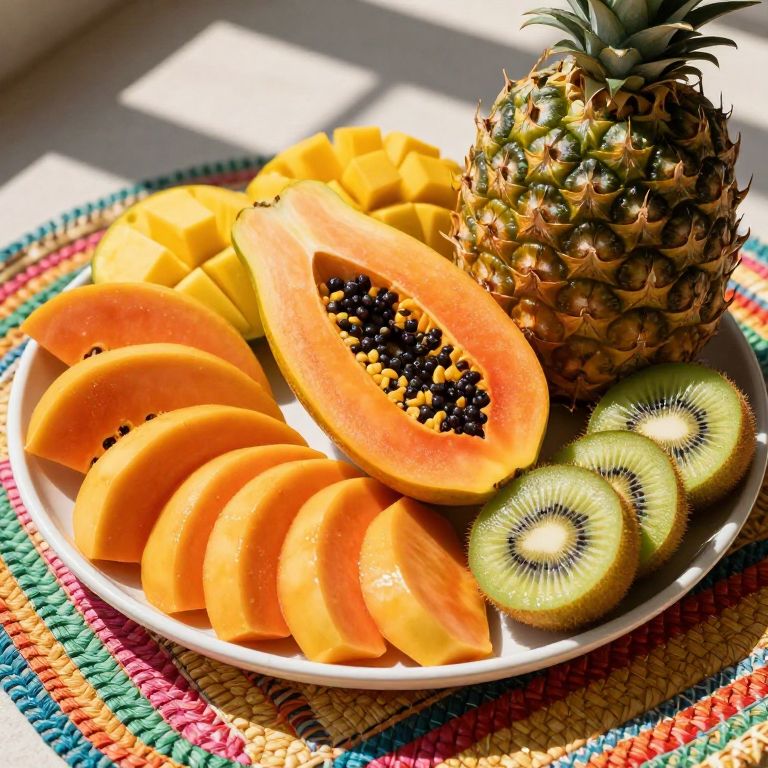 A beautifully arranged tropical fruit platter featuring ripe papaya slices, mango, pineapple, and kiwi on a colorful woven mat, sunlight casting shadows, high detail, bright and inviting, realistic tropical still life