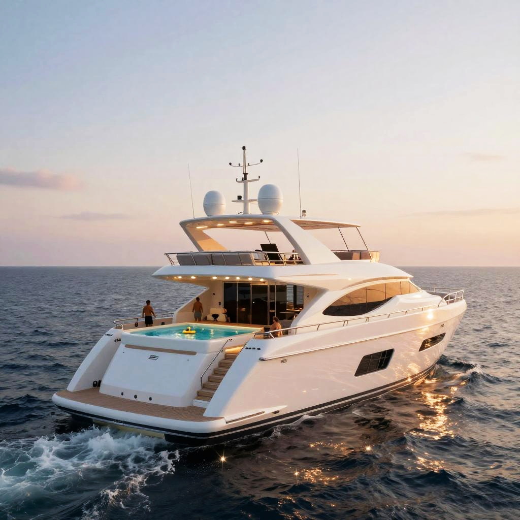 Yachting lifestyle portrayed on an open sea, luxury yacht equipped with modern amenities, people socializing by the pool on deck, sparkling water and soft pastel sky background during golden hour, hyperrealistic style with focus on elegance and comfort.