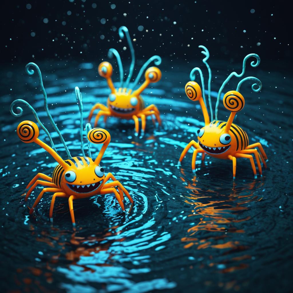 Children's picture book illustration of mice and spiders and beetles darting across a wooden floor, looking back in fear, in a whimsical Disney animation, ar 2:3, highly detailed, colorful, engaging