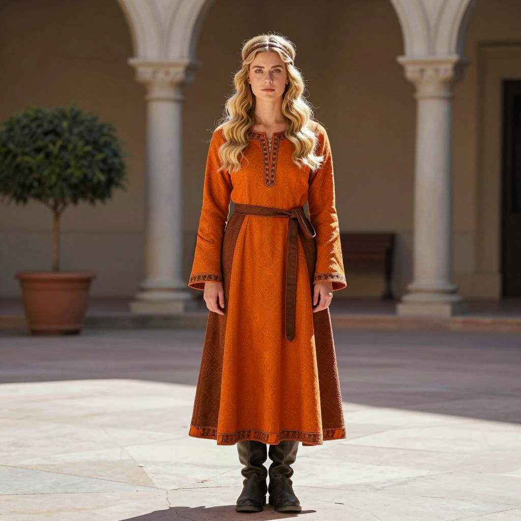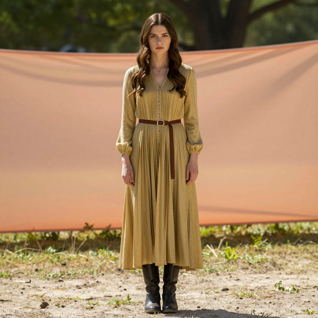 Carrie dress movie costume, photograph of a young woman, standing outdoors, wearing a long, gold-colored, pleated dress with a brown belt, and black boots, long brown hair, serious expression, sunlight, background with peach-colored tarp, green trees, grass and dirt ground, full body shot, daytime, realistic style, natural light, casual fashion, simple and elegant look