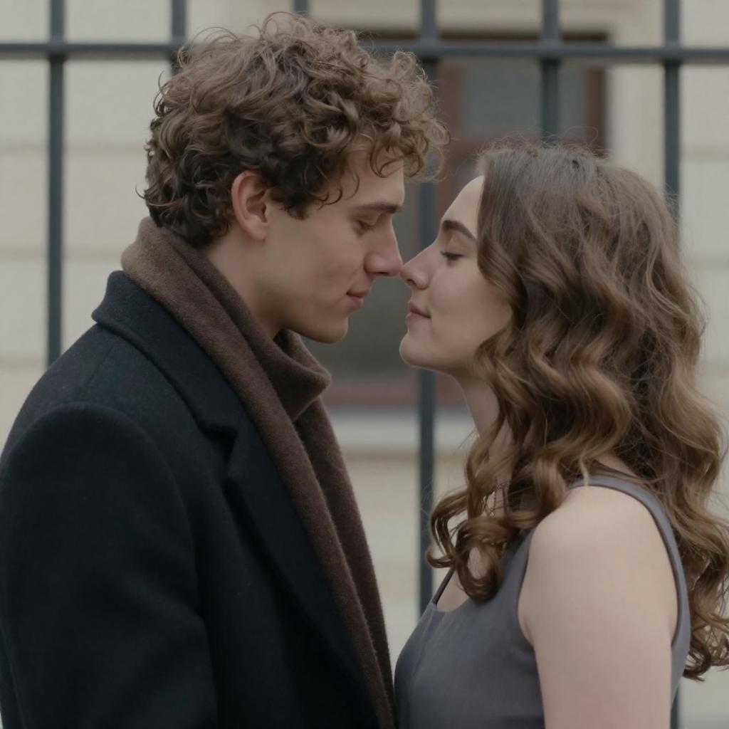 Photograph of a man and woman kissing outdoors. Man has curly brown hair, light skin, wearing denim jacket over brown shirt. Woman has long brown hair in ponytail, light skin, wearing pink shirt. Green foliage in background. Man's right arm around woman's back. Tongues visible in kiss. Both eyes closed. Man's left hand holding woman's shoulder. Bright daylight.
