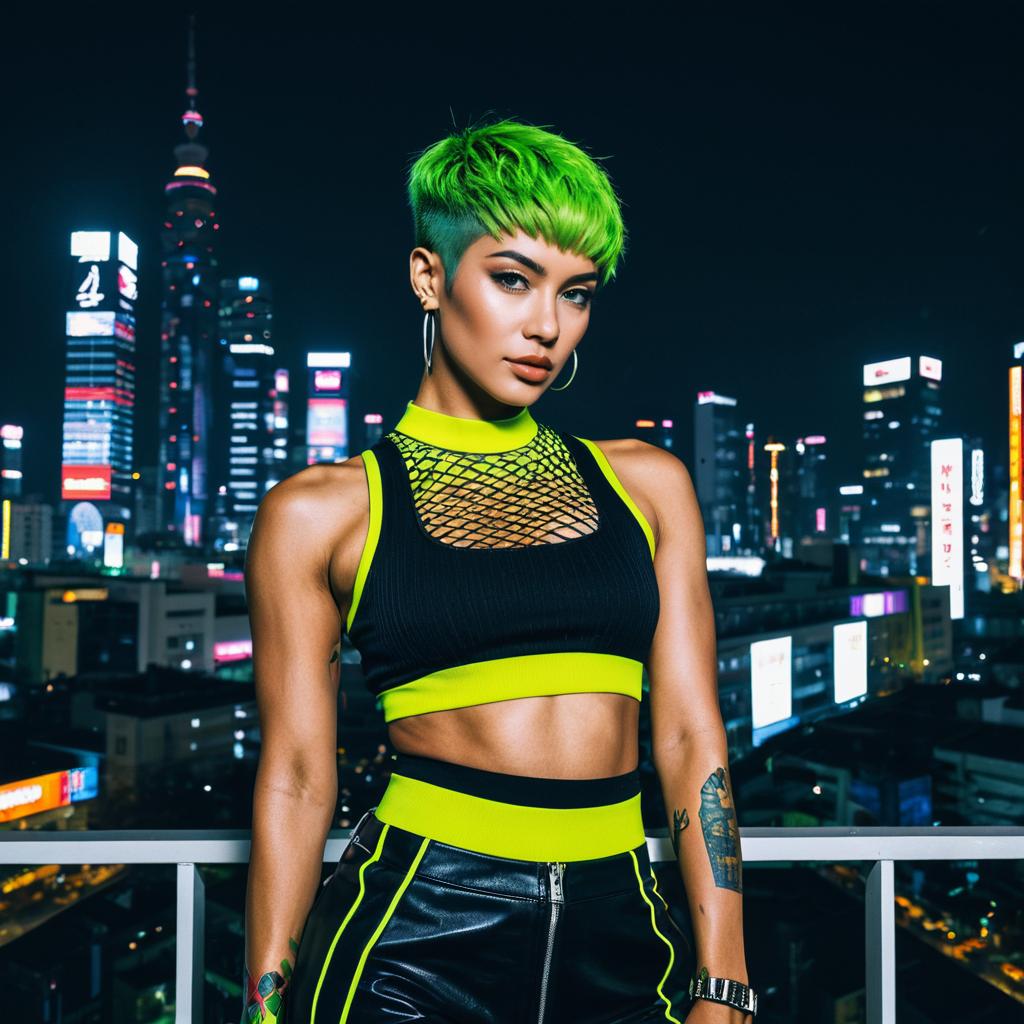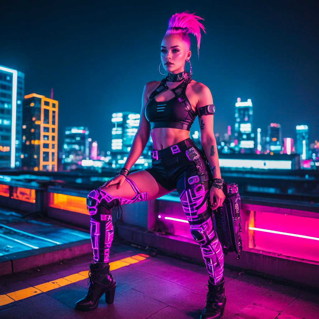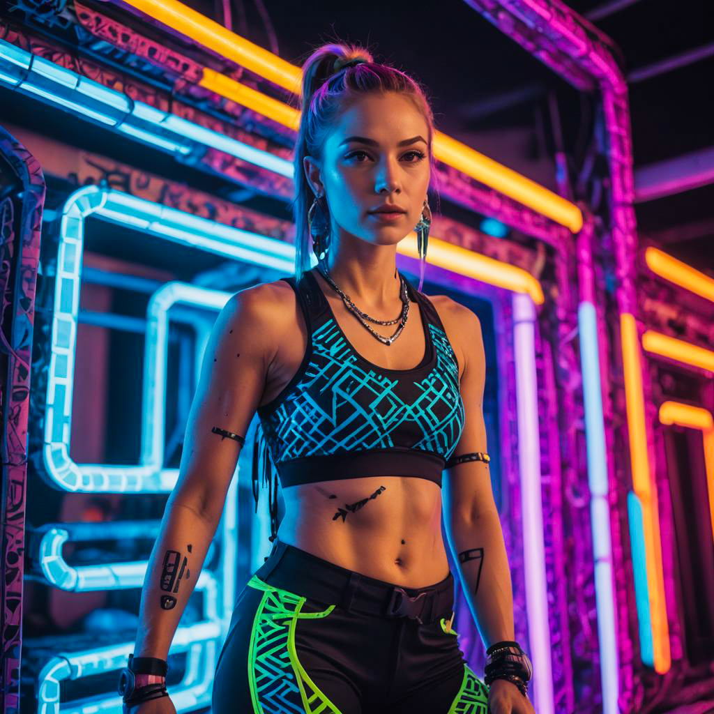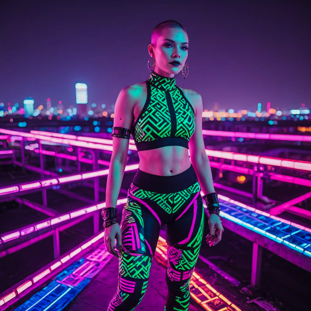Photo of a Slender Line woman, Vibrant T恤 Waves, rave outfit, neon colors, reflective materials, mesh crop tank, spotted tights, platform heels, LED accessories, cyberpunk style, bold patterns, vibrant makeup, Laser Purple Shiny polyester, waterfront concert, old-fashioned black and white