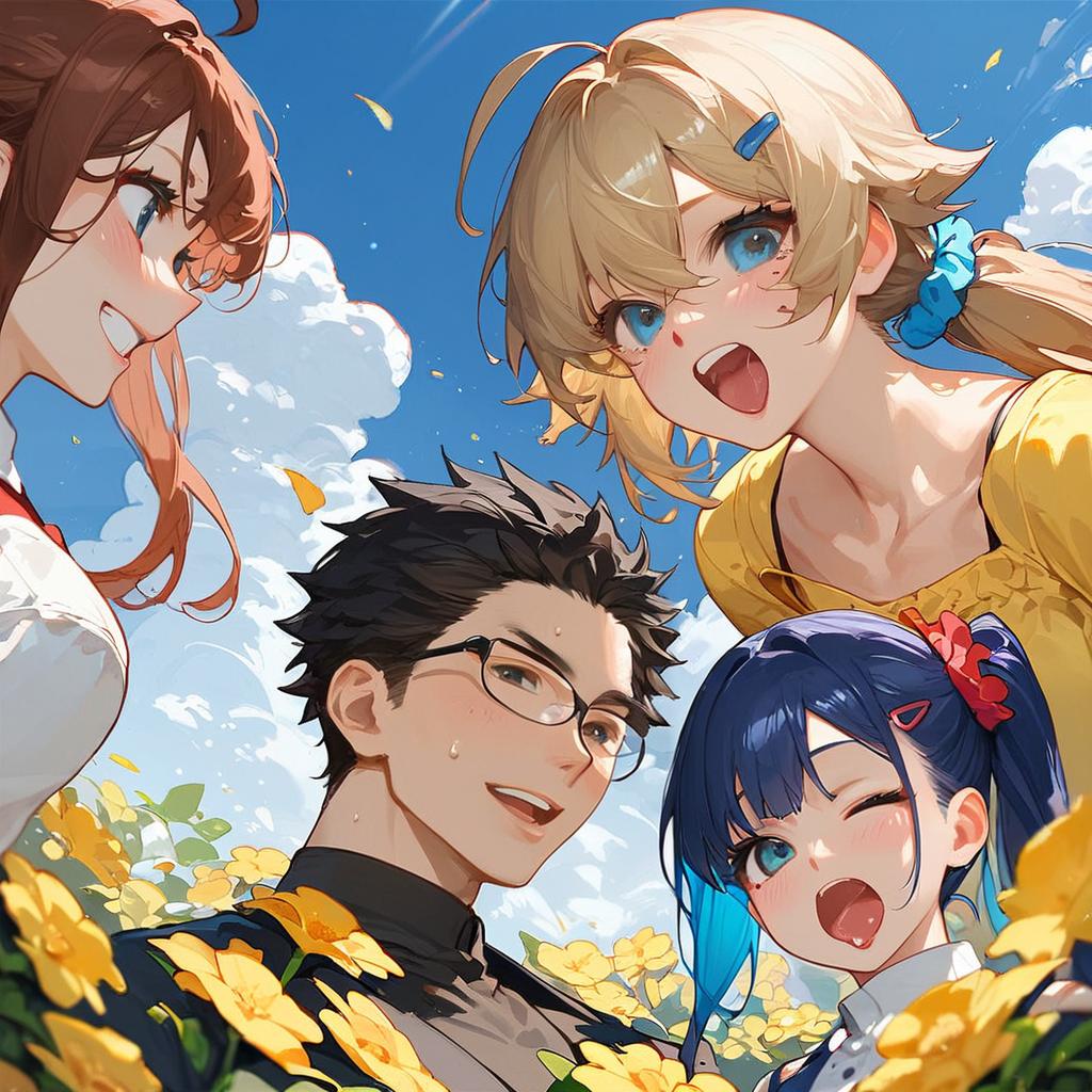 Score_9, score_8_up, score_7_up, source_anime, anime screencap, 6+girls, 2boys, border, blush, shy, brown hair, bangs, very long hair, ponytail, green eyes, glasses, collared shirt, black jacket, short hair with long locks, hair flower, smirk, gradient hair, blue eyes, hair ribbon, red ribbon, tsundere, annoyed, mole under eye, blue hair, short hair, angry, anger vein, crying, ahoge, side ponytail, hair scrunchie, hairclip, looking to the side, dio face, open mouth, smile, KONO DIO DA