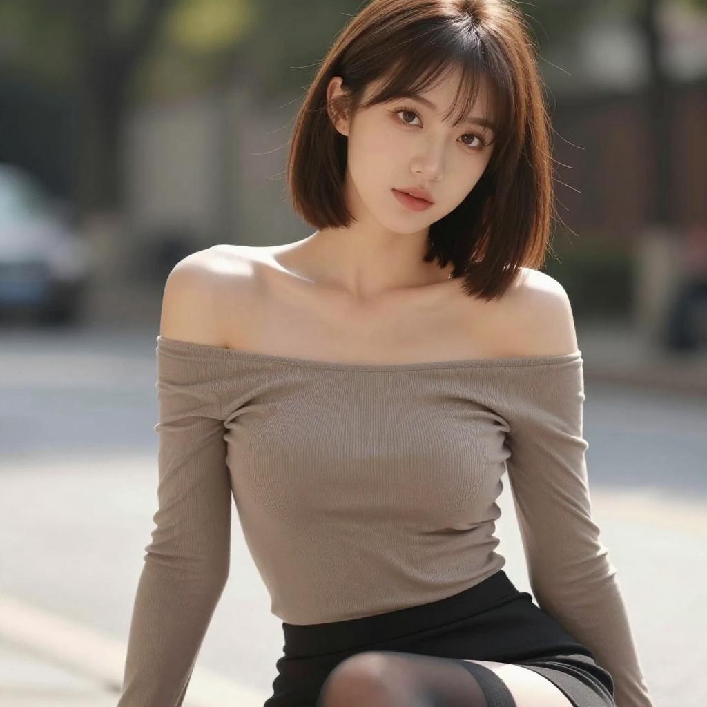 Photograph of a young woman with long brown hair, lying on a white couch. She's wearing a gray crop top that exposes her midriff, black and white panties, and gray knee-high socks. Her legs are bent at the knees, resting on the back of the couch. The background has a rustic wooden wall and a golden bowl. She has a relaxed, slightly seductive expression and is looking at the camera.
