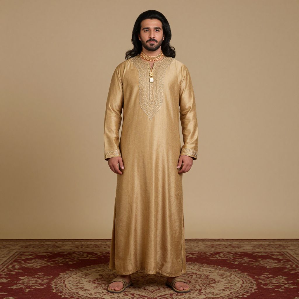 Photograph of a South Asian man with long black hair and a beard, standing against a plain beige background. He wears a long, gold-colored traditional kameez with intricate embroidery on the chest and sleeves, and brown sandals. His hands rest at his sides. The floor is covered with a red and beige patterned carpet. The man's expression is neutral, and he gazes directly at the camera. The lighting is even, highlighting the texture of the fabric and the details of the embroidery.