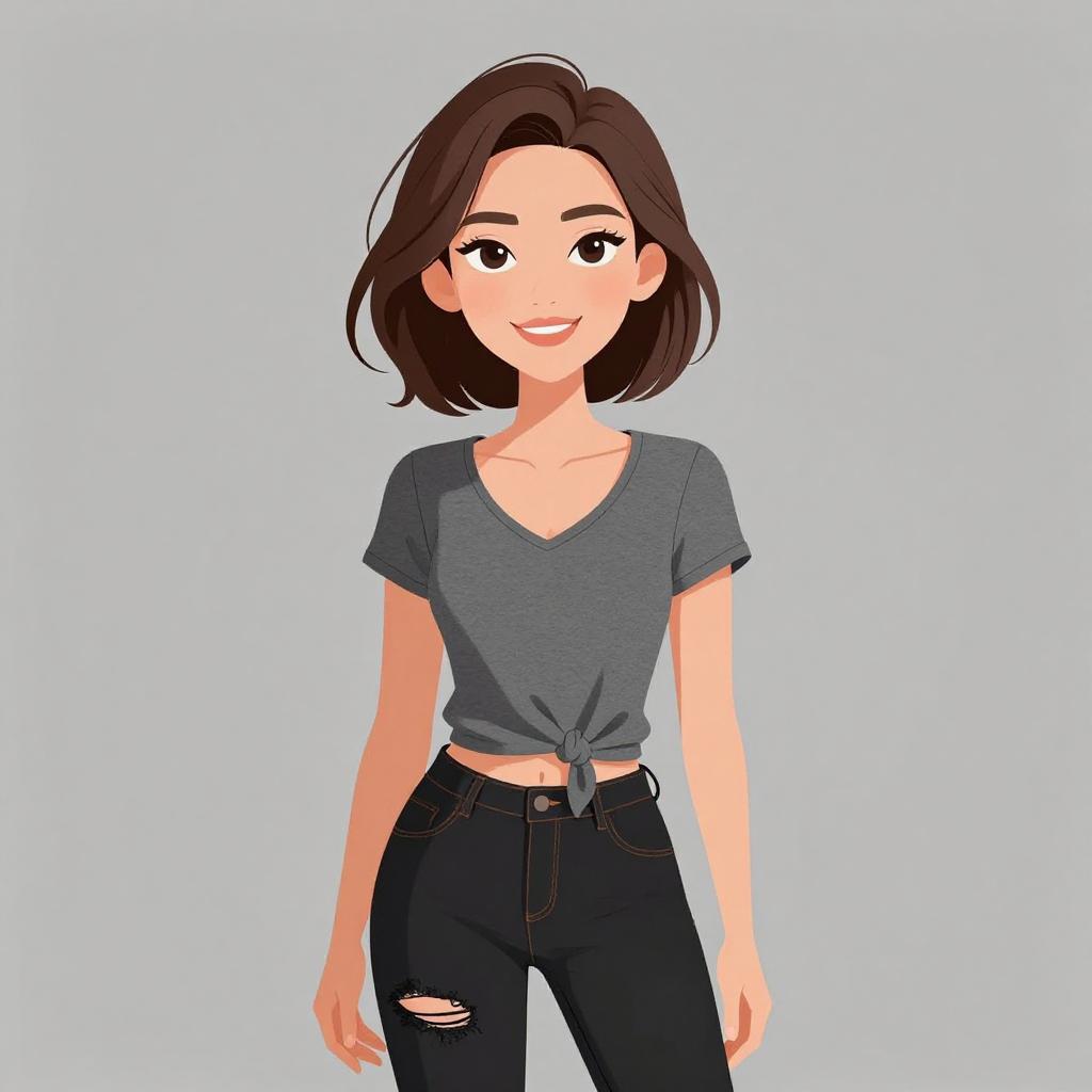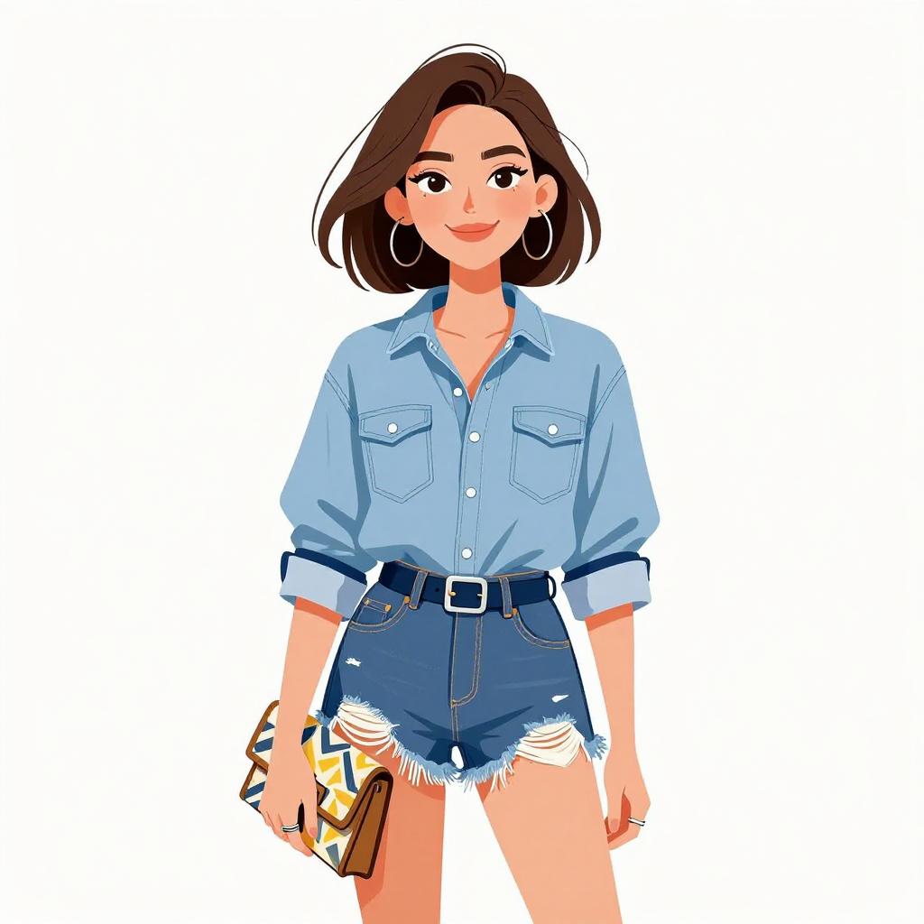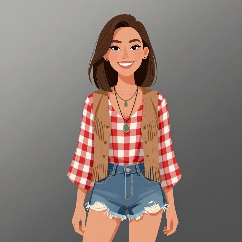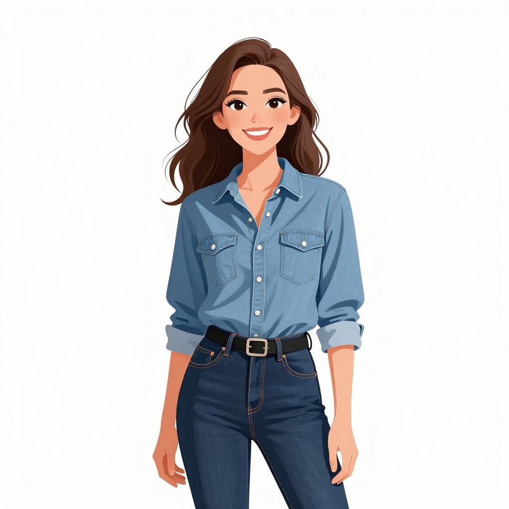 Woman with pretty face and pretty hair. smiling Woman, casual street style, light-wash denim jacket, white scoop-neck t-shirt, gray skinny jeans, plaid flannel shirt tied around the waist, black leather belt with silver buckle, layered gold necklaces, photo studio with white brick background. --sref 1467