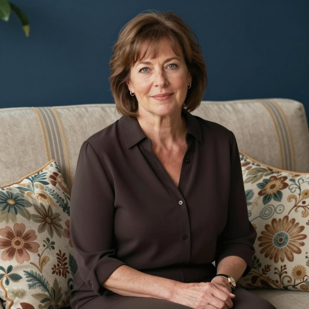 Middle-aged woman with short brown hair, wearing a dark brown blouse, sitting on a couch. She has light skin and blue eyes, with a slight smile. The couch has multiple patterned cushions, including floral and striped designs. Background is dark blue. Her hands are resting on her lap. Green plant leaves are visible in the top left corner.