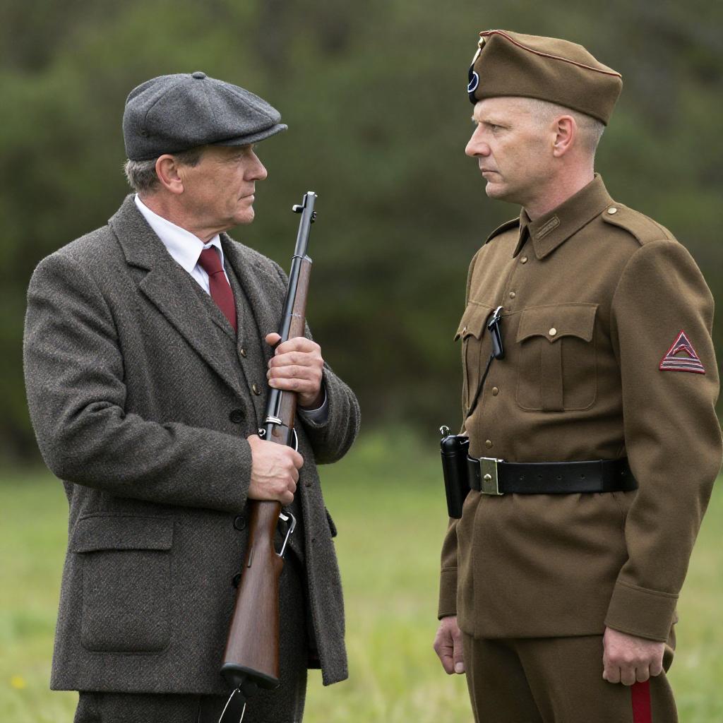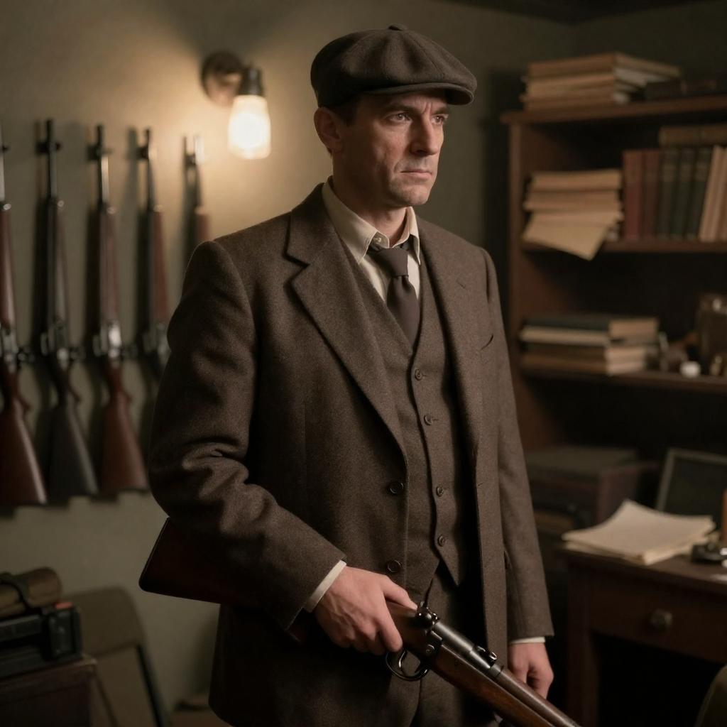 Photograph of a serious, middle-aged man in a brown suit and flat cap, standing in a dimly lit, cluttered room. He holds a rifle, looking to the right. Behind him, a wall of rifles and a shelf with books and papers are visible. A bright light illuminates part of the background.