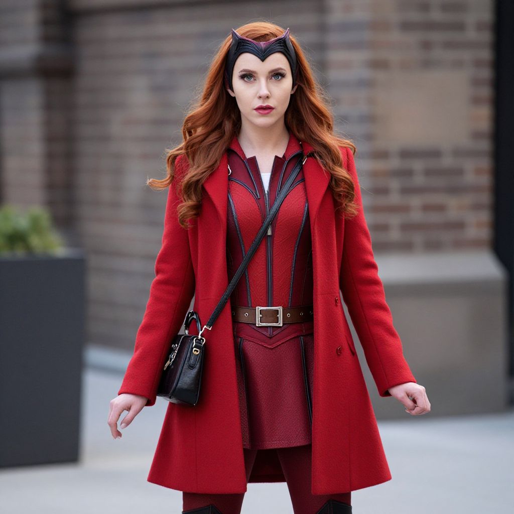 Scarlet Witch Red Costume, woman in a red coat and hat with a black bag
