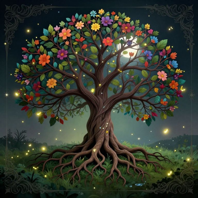 The image presents an intricately detailed tree of life, exuding a mystical and ethereal aura. The tree, with its sprawling roots and branches, is adorned with vibrant, colorful leaves and flowers, creating a sense of vitality and growth. The roots, intertwined and complex, extend outward, grounding the tree in a lush, green landscape. Surrounding the tree is an ornate border, featuring delicate floral patterns and stars, adding to the fantastical atmosphere. Fireflies, glowing with a soft, warm light, flutter around the tree, enhancing the mystical quality. The background is a gradient of dark to light, with a full moon peeking through the branches, casting a serene glow. The overall composition is balanced, with the tree centrally positioned, and the elements harmoniously arranged, creating a cohesive and enchanting scene.