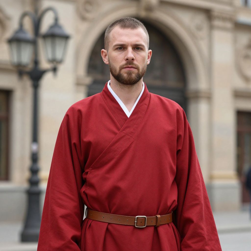 Man with short hair and beard wearing a red robe with a white collar and a brown belt. He is standing in front of a building with a street lamp.