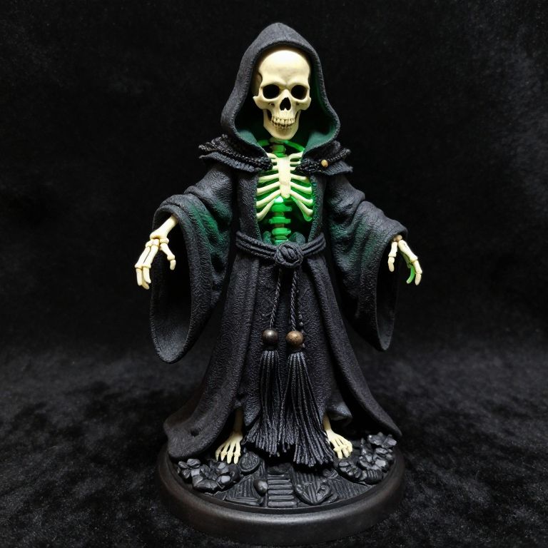 Tassel Making a skeletal figure in dark mage robes, emerald green light glowing from within the skull,