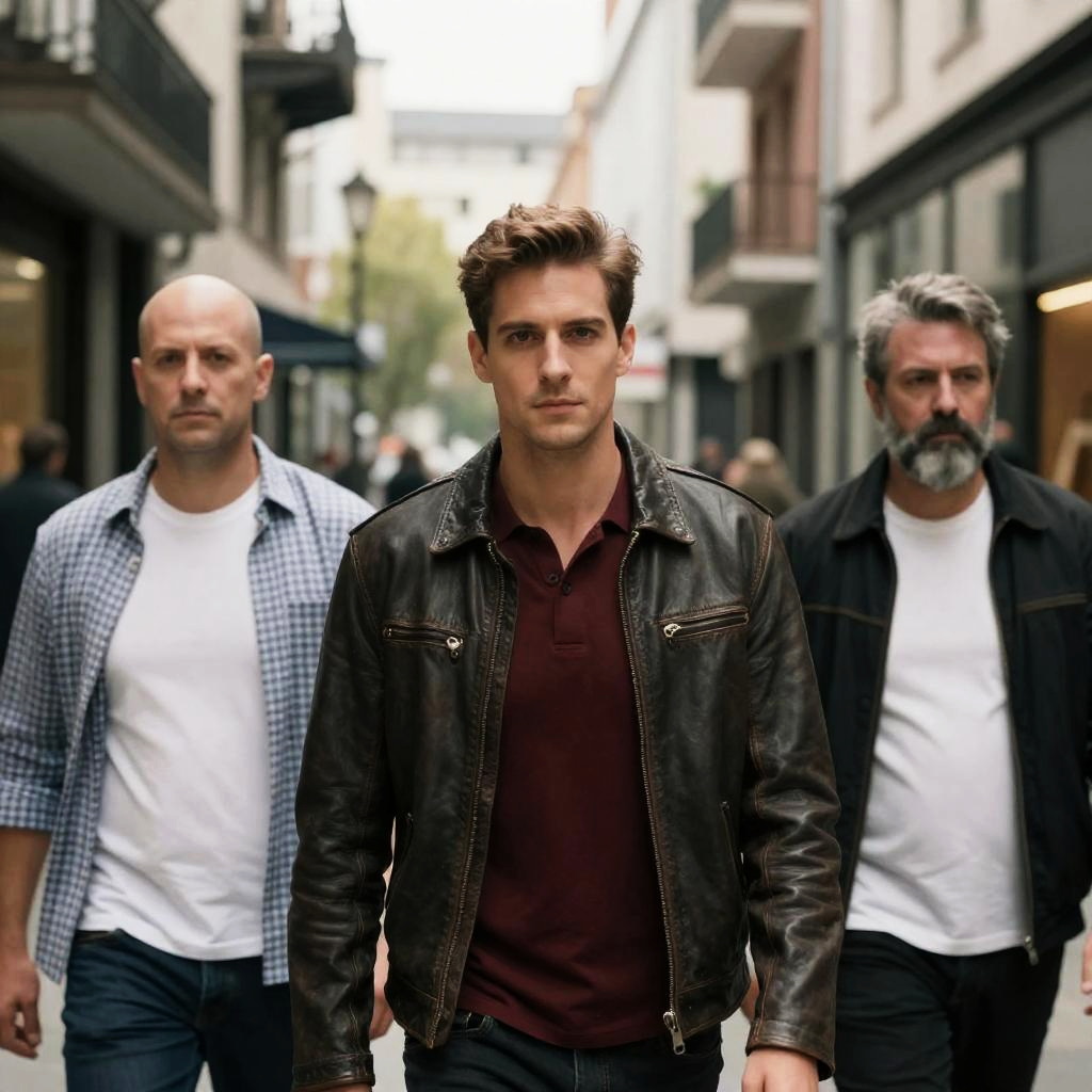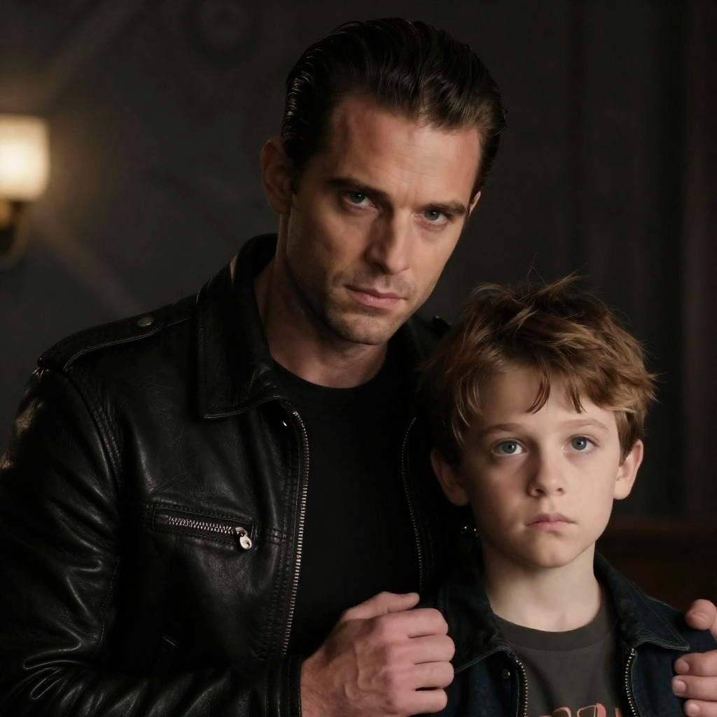 Photograph of a man and young boy standing together on stage. Man in black leather jacket, short dark hair, serious expression. Boy in black jacket, light brown hair, looking away. Large circular metal backdrop with illuminated bulbs. Man's arms around boy's shoulders. Bright stage lights in background. Man stands slightly taller, boy slightly shorter. Industrial setting.