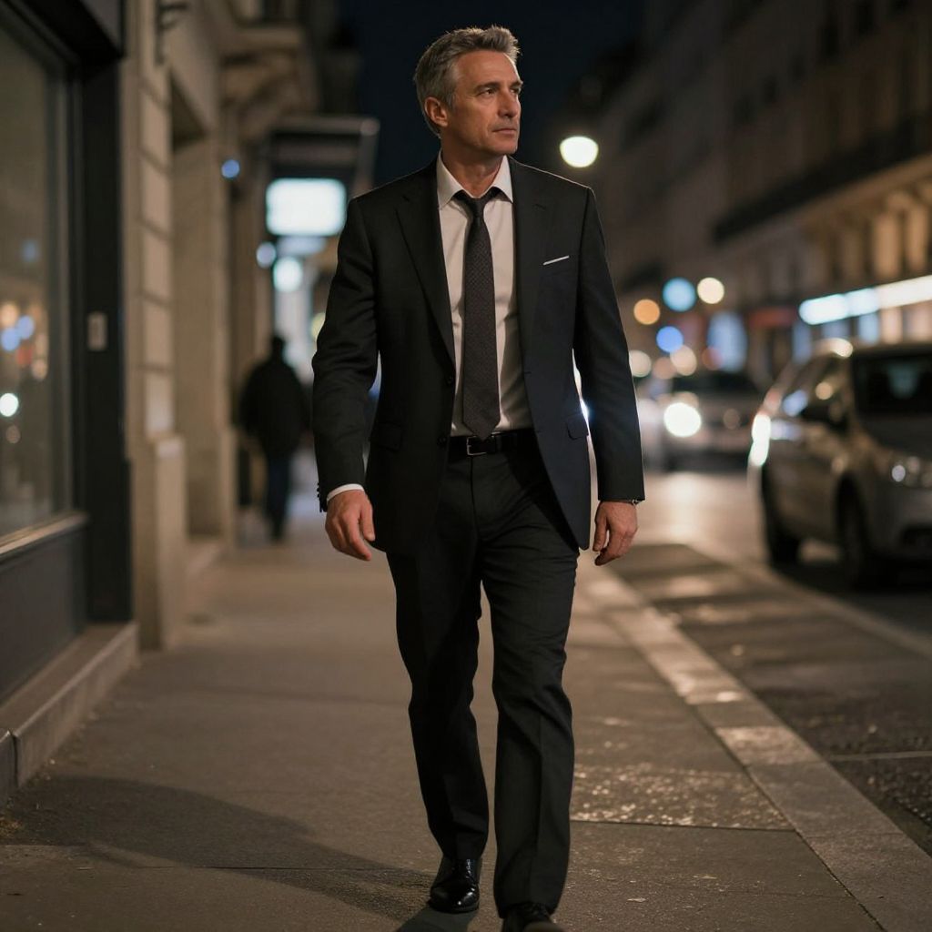 A man in a modern suit with greying short hair walks down a street in Paris at night, with a high-detailed, photo-realistic rendering featuring volumetric lighting and ambient occlusion.