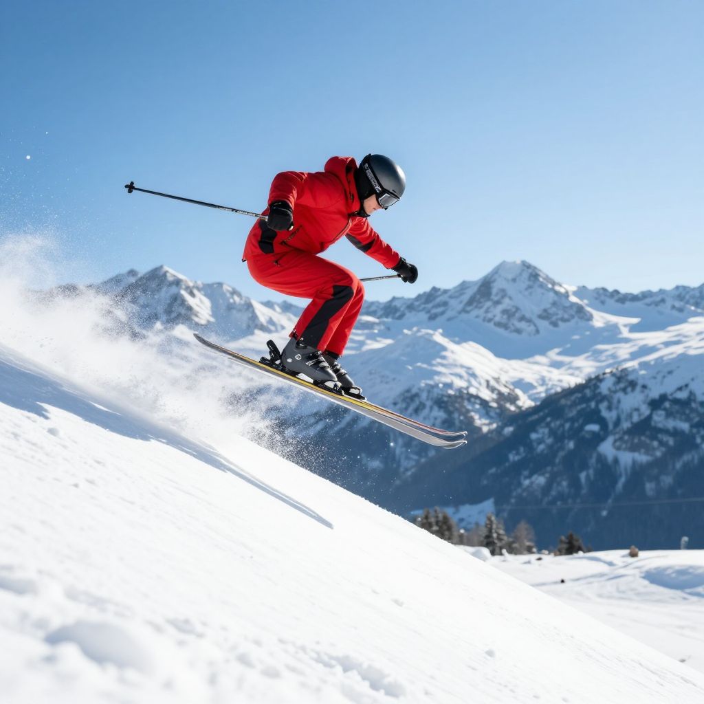 Skier in red and black winter sportswear performing a jump on a steep snowy mountain slope with snow-covered peaks in the background. The athlete is equipped with ski poles, helmet, goggles, and ski boots, captured mid-air with a clear sky above.