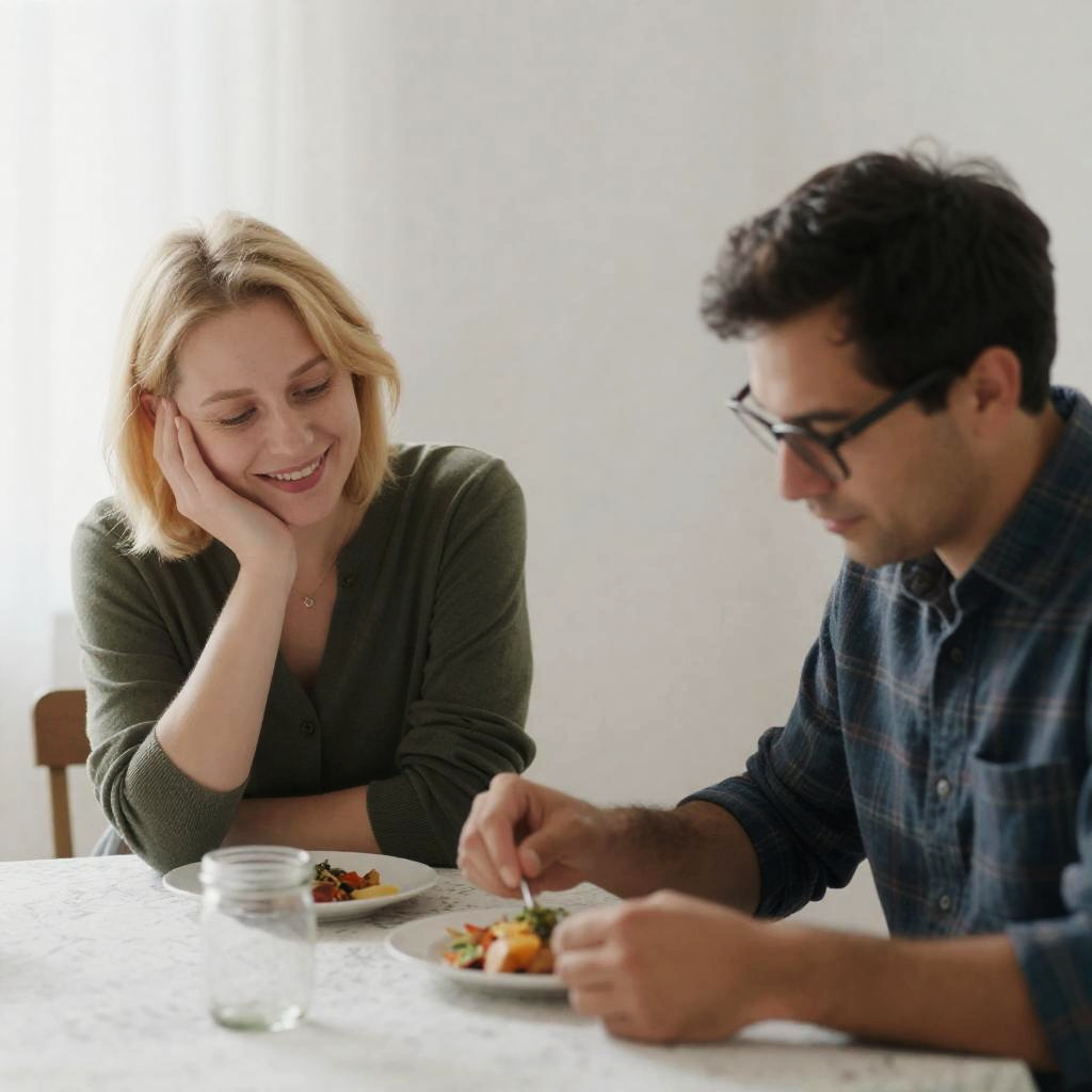 Blonde woman in brown apron laughing, standing beside dark-haired man in black polo, holding food. Warm indoor setting, wooden table, green chair, beige curtains, lamp in background. Both smiling, casual interaction. Two people, relaxed atmosphere.