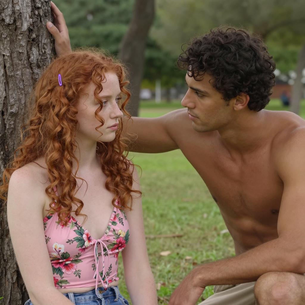A shirtless, muscular man with dark curly hair and tanned skin leaning towards a red-haired woman with curly hair, wearing a pink floral halter top. They sit against a tree in a grassy park with green trees in the background. The man has a focused expression, while the woman looks downward with a neutral expression. The woman's hair has a purple hair clip. The background includes blurred greenery.