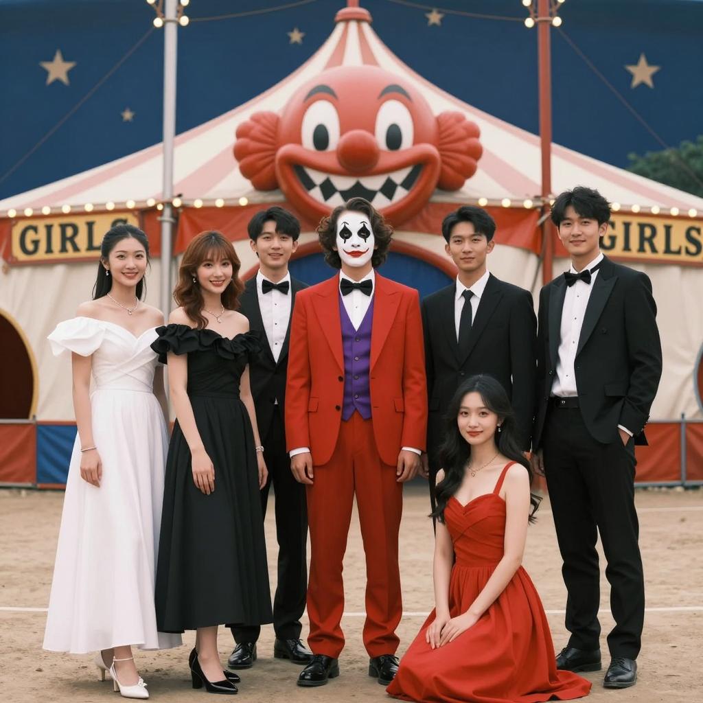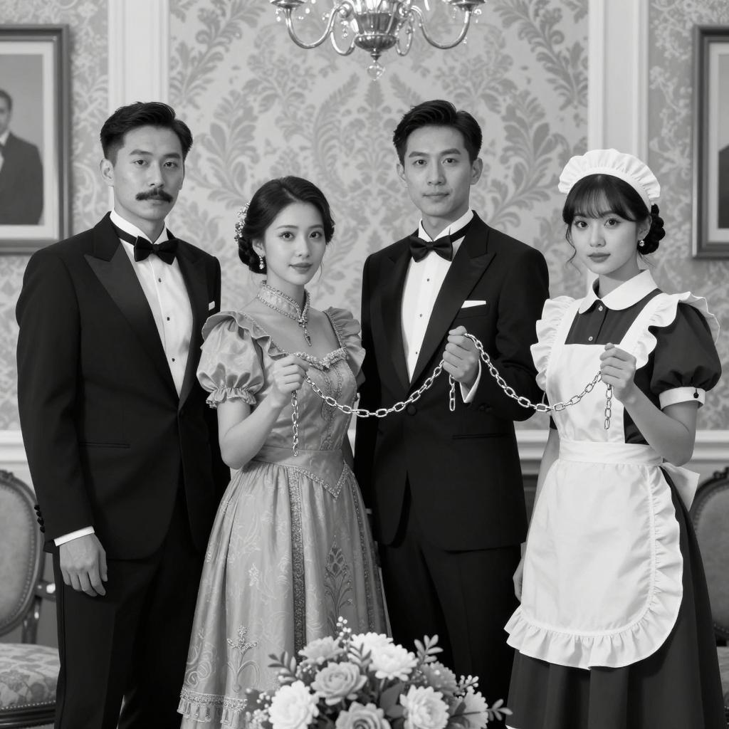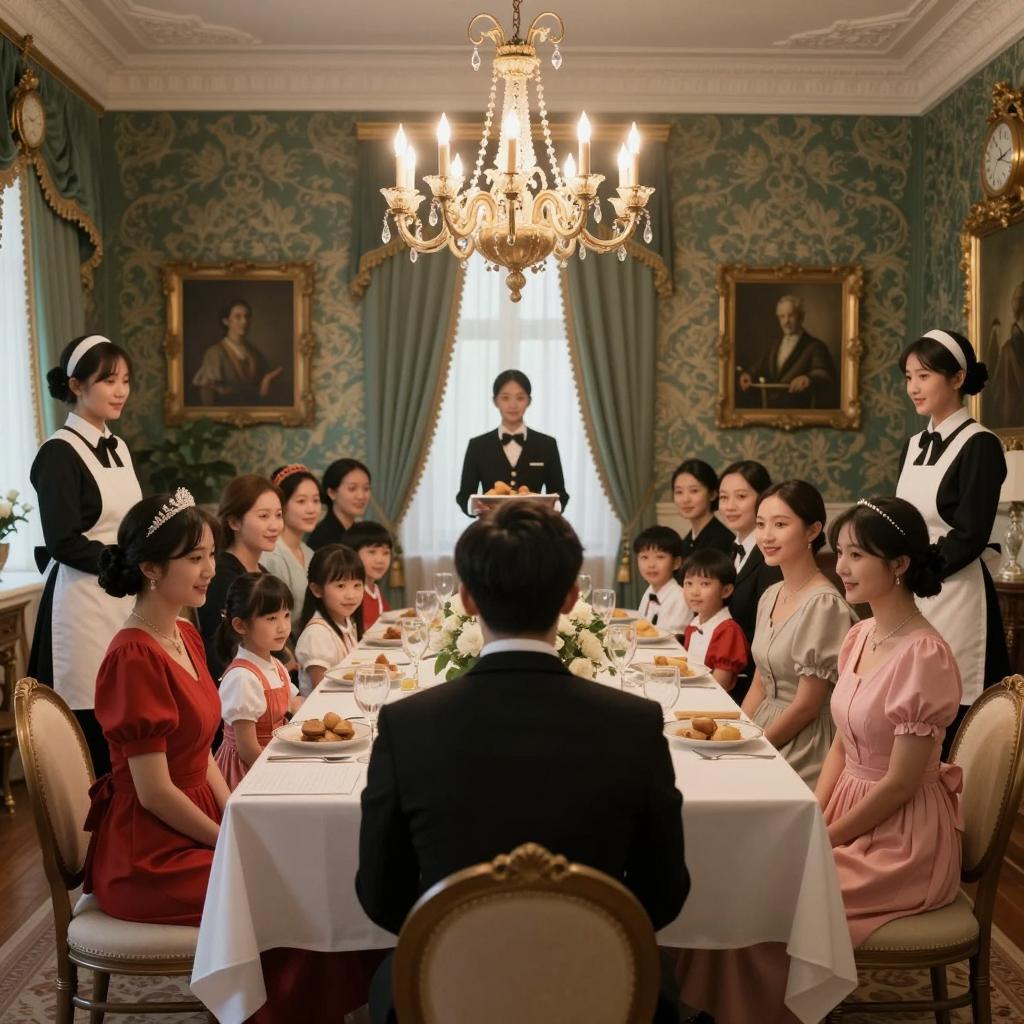 Formal dining room with chandelier, green drapes, and ornate wallpaper. Man in black suit sits at table, facing group of 13 people. Women in red and pink dresses, children in matching outfits, and maids in black and white uniforms. Clock and paintings on walls. Maids standing and sitting, some holding trays. Rich ures, elaborate decor. Man with back to viewer, writing on paper. Children and women looking at man, some smiling.