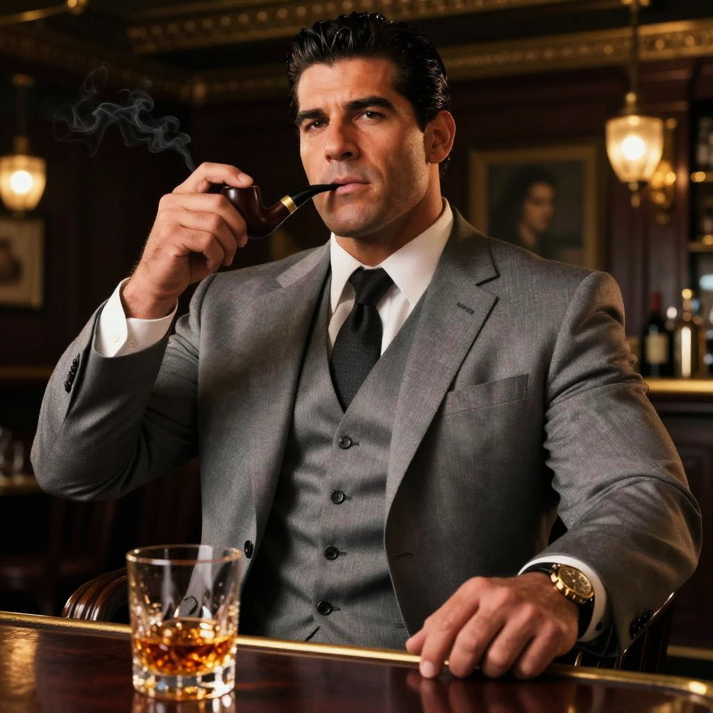 Realistic photo.Highly detailed scene in the style of Greg Capullo, showing a muscular Hispanic man in his late 20s in a fitted grey suit, sitting at a pub with luxury whiskey glasses and a pipe, low angle dramatic shot, hyper-detailed and elegant, cinematic pub ambiance. realistic photo